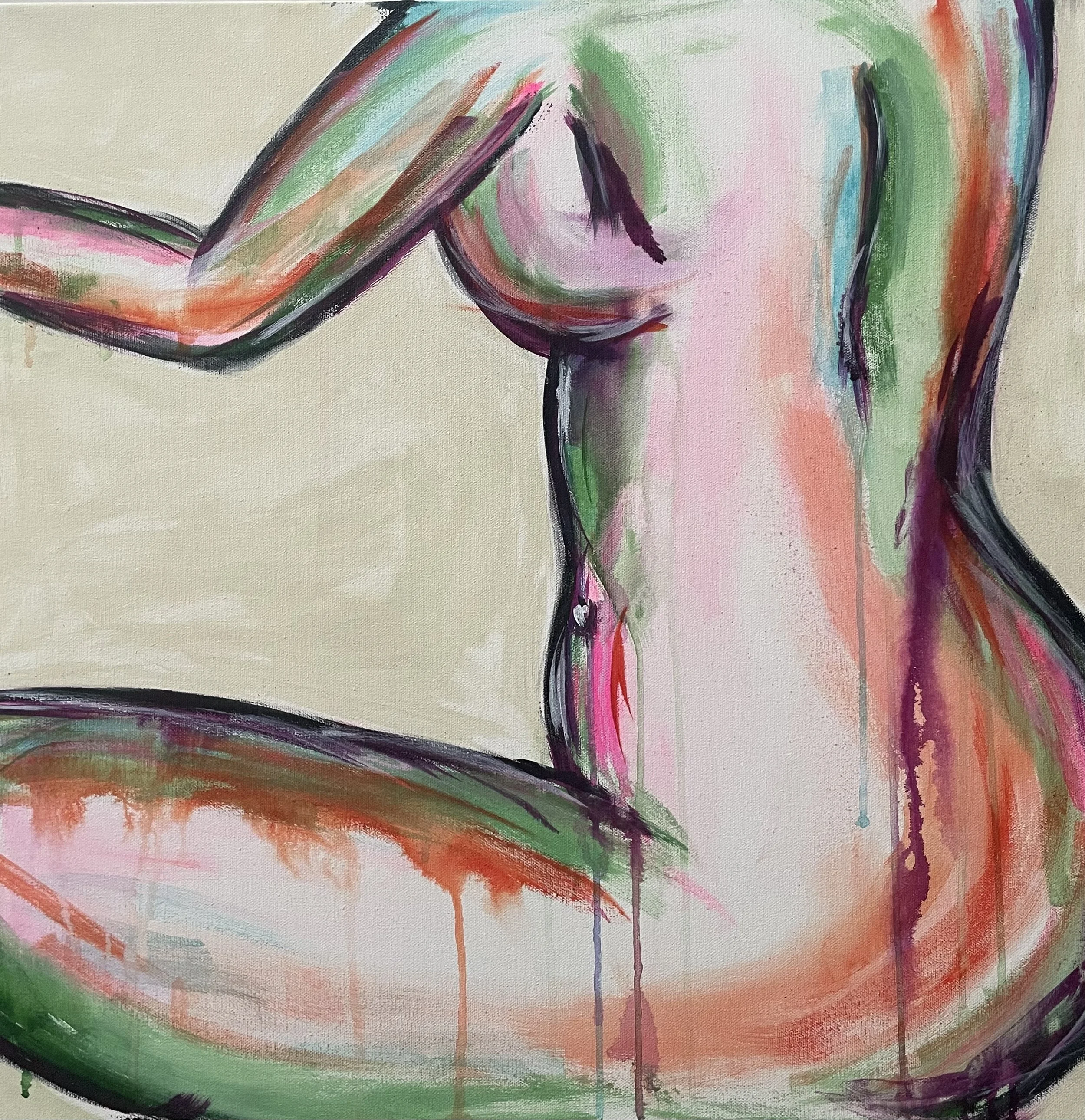Color slips and slides across the surface—unexpected greens, warm reds, soft pinks, and inky outlines working together to highlight curves and motion. Drips are left to run, lines wander, and the process stays visible. As one of four in the series, this piece holds its own energy while also fitting into a larger conversation about form, freedom, and not taking the body (or painting) too seriously.